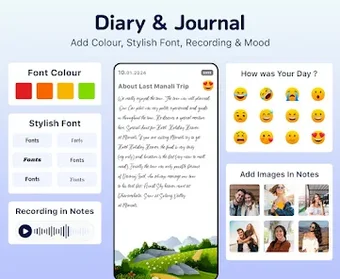 แอป My Diary - Daily Journal เป็น sol ution ที่รวมอยู่ในที่เดียวสำหรับการติดตามกิจกรรมประจำวันส่วนตัวอย่างเรียบร้อย แอปพลิเคชันนี้ช่วยให้ผู้ใช้สามารถสร้างบันทึกประจำวันพร้อมพื้นหลังสีสดใส รูปภาพ วิดีโอ แบบอักษรที่ดูดี และธีมที่กำหนดเอง มันเป็นพื้นที่ส่วนตัวสำหรับผู้ใช้ที่จะแสดงออก สะท้อน และจัดระเบียบความคิดของตนเป็นประจำ จับเอาช่วงเวลา ความรู้สึก ความคิดลับ และประสบการณ์ไว้โดยไม่ต้องพยายาม